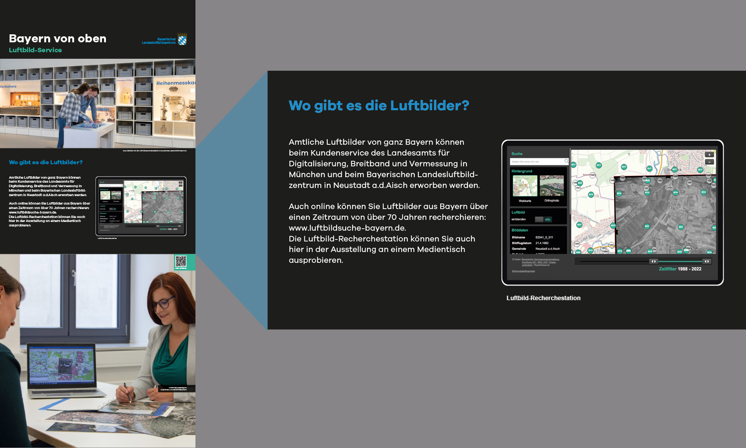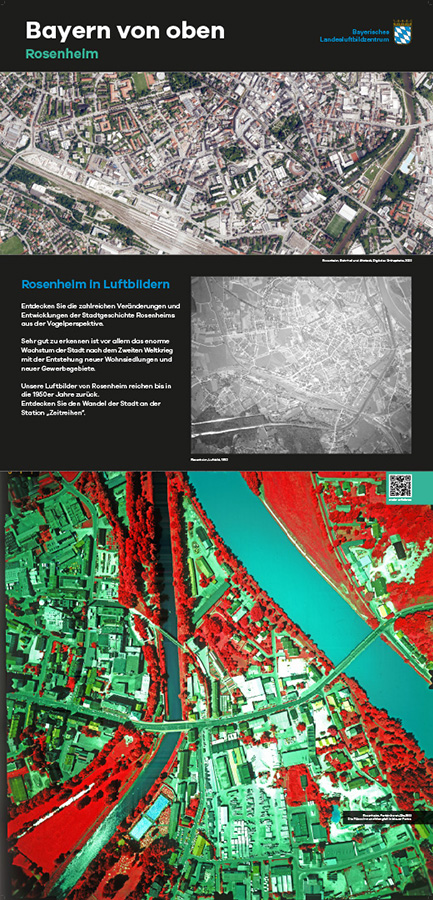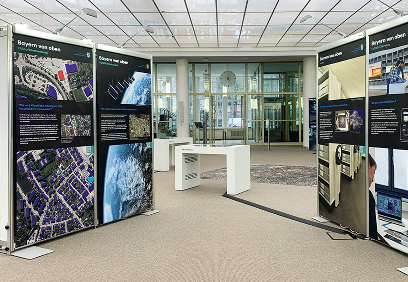 Anlässlich des fünfjährigen Bestehens des Bayerischen Landesluftbildzentrums stellte die Wanderausstellung dessen Angebote einem breiten Publikum vor. Die multimedial gestaltete und leicht verständlich aufbereitete Ausstellung vermittelt einen spannenden Einblick in die Geschichte und Technik der Luftbildfotografie. Auf 14 Ausstellungstafeln wurde den Besucherinnen und Besuchern gezeigt, wie Luftbilder gemacht werden, wie sie aufbereitet werden und wo sie eingesetzt werden.